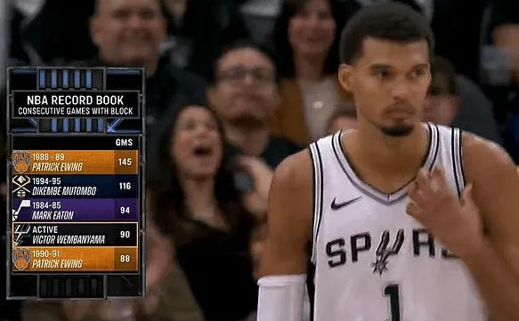 同时,文班亚马已经保持连续90场比赛送出盖帽,排名历史第4,第一名是尤因的145场比赛,从数据看,只要文班亚马保持健康,这个记录一定会被打破!