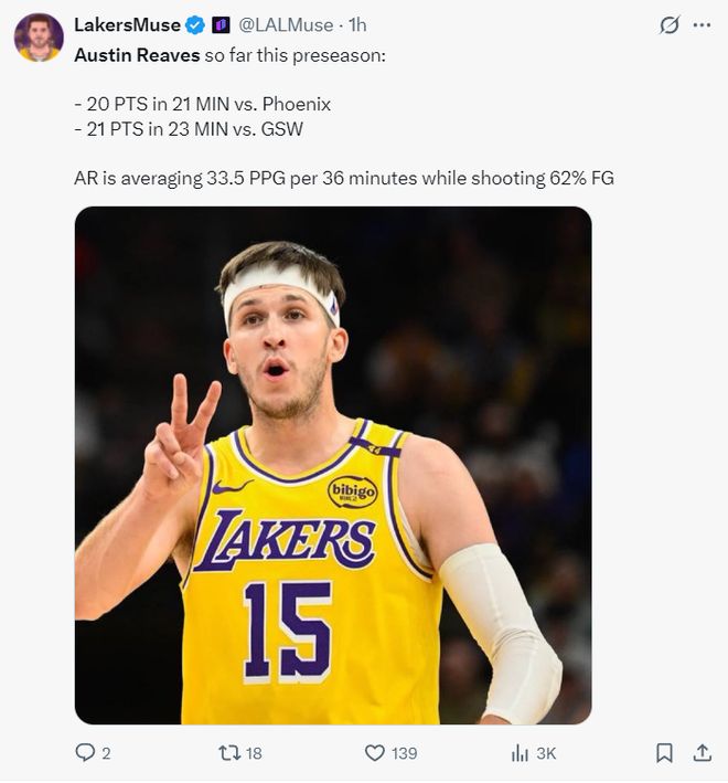 里夫斯目前已经确定会在湖人打先发,他这两场季前赛都非常高效,对阵太阳。21分钟,11中6,三分5中1,罚球7中7,拿到20分3篮板2助攻;对阵勇士23分钟,10中7,三分4中2,罚球6中5拿到21分3篮板3助攻1抢断1盖帽,两场比赛合计41分5助攻。