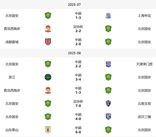 本赛季国安原本是半程第一,结果在关键战中连续1比3不敌申花和0比2败给成都蓉城。
